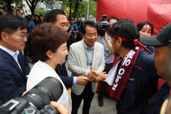 이 최고위원은 이날 철탑에서 내려 온 김형수 지회장을 만나 악수를 나누기도 했다.