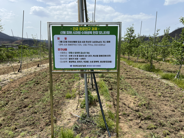 조영숙 경상북도농업기술원장은 “산불 피해받은 사과나무의 생육 상태를 정밀하게 분석해 묘목 갱신 여부를 과학적으로 판단할 수 있는 기준 마련과 사과 농가의 조기 회복을 위한 정밀 모니터링 연구에 최선을 다하겠다”고 밝혔다.