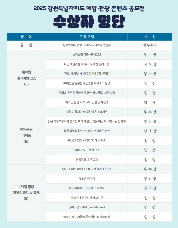 이번 공모전은 강원 동해안 6개 시군의 특색 있는 자원을 활용해 체류형 관광 코스, 해양 기념품, 지역축제 콘텐츠를 발굴하기 위해 마련됐으며 2025년 6월 10일 강원관광재단 본사에서 전문 심사위원 7인이 참여한 심사위원회를 통해 엄정한 심사가 이뤄졌다.