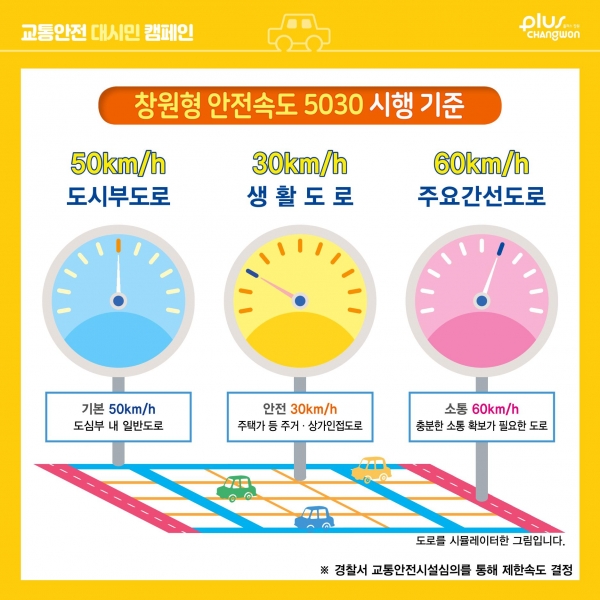 ‘창원형 안전속도 5030’은 도시부 도로는 시속 50km/h, 주택가 등 생활도로는 30km/h, 주요간선도로는 60km/h로 제한 속도를 조정하는 교통안전 정책이다.