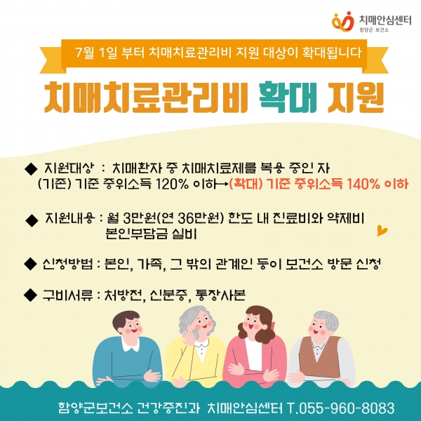 [아시아월드뉴스] 함양군은 오는 7월부터 치매 환자를 위한 치료관리비 지원 기준을 기존 중위소득 120% 이하에서 140% 이하로 확대 시행한다고 밝혔다.