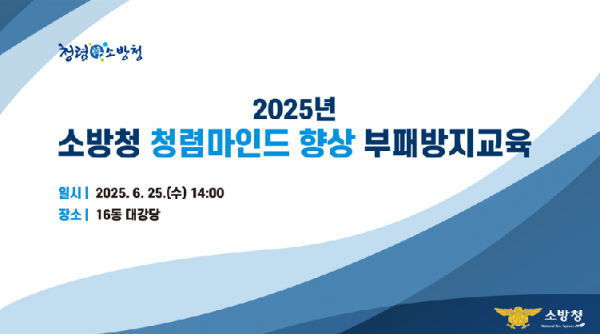 [아시아월드뉴스] 소방청은 25일 전 직원을 대상으로 ‘2025년 소방청 청렴마인드 향상 부패방지교육’을 실시하며 국민에게 더욱 신뢰받는 청렴한 조직 구현을 위한 청렴문화 확산에 적극 나선다고 밝혔다.