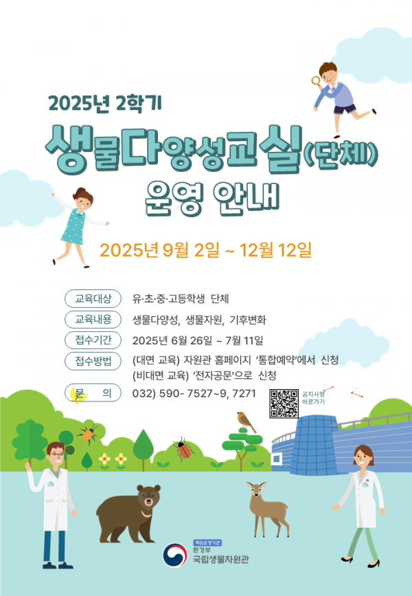 [아시아월드뉴스] 환경부 소속 국립생물자원관은 6월 26일부터 유아, 어린이, 청소년을 대상으로 2025년도 2학기 생물다양성교육 참가자를 모집한다고 밝혔다.