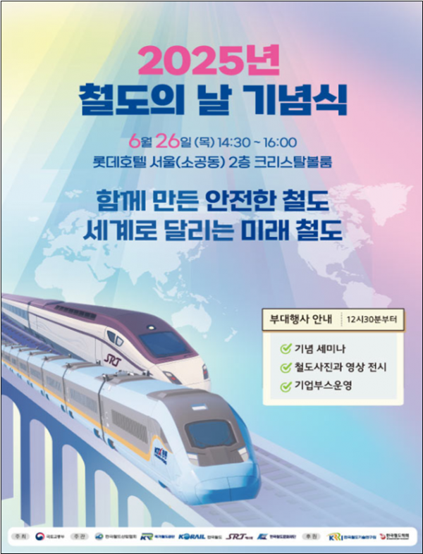 [아시아월드뉴스] 국토교통부는 6월 26일 오후 3시 서울에서 백원국 제2차관, 철도업계 대표, 관계자 등 총 400여명이 참석한 가운데 ‘2025 철도의 날’ 기념식을 개최한다.