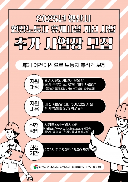 [아시아월드뉴스] 양산시는 열악한 환경에서 근무하는 현장 노동자들의 휴식권을 보장하기 위해‘2025년 현장 노동자 휴게시설 개선사업’의 추가 사업 시행자를 모집한다.