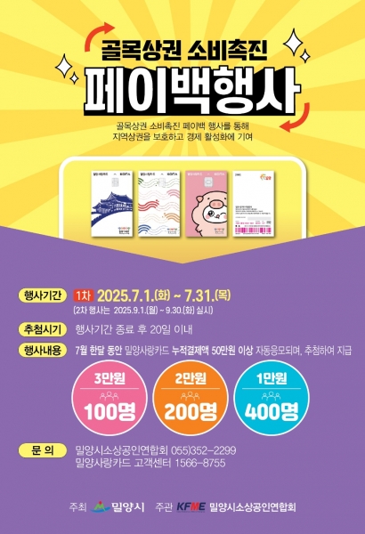 [아시아월드뉴스] 밀양시는 여름 휴가철을 맞아 침체된 지역 상권에 활력을 불어넣기 위해 7월 한 달간 ‘골목상권 소비촉진 페이백 이벤트’를 실시한다고 26일 밝혔다.