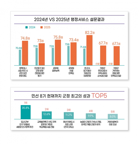 한편 민선 8기 군정의 미래 전망에 대한 군민 평가 결과, ‘좋아질 것’ 이라는 응답이 전년도 71.4%에서 82.2%로 상승해, 군정 운영에 대한 군민 만족도와 신뢰가 매우 높은 것으로 나타났다.