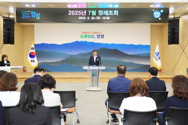 [아시아월드뉴스] 함양군은 30일 오전 군청 대회의실에서 직원 120여명이 참석한 가운데 2025년 7월 정례 조회를 개최했다.