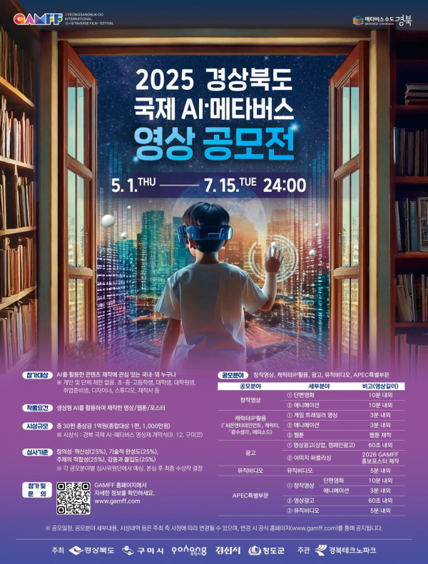 [아시아월드뉴스] 경상북도는 ‘2025 경북 국제 AI·메타버스 영상 공모전’의 작품 접수 마감일을 애초 6월 30일에서 7월 15일 24:00까지로 15일간 연장한다.