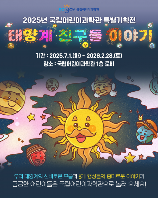 [아시아월드뉴스] 국립어린이과학관은 우주강국으로 도약하는 대한민국의 어린이들에게 태양 및 8개 행성들의 다양한 특징과 태양계의 신비로운 모습을 어린이들이 좋아하는 이야기로 설명해 우주에 대한 호기심을 자극하고 나아가 우주에 대한 꿈과 희망을 키울 수 있도록 기획한 ‘태양계 친구들 이야기’를 2025년 7월 1일부터 2026년 2월 28일 까지 개최한다.