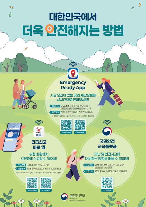 김용균 안전예방정책실장은 “행정안전부는 국내에 거주하는 외국인도 쉽고 편리하게 재난안전정보를 받을 수 있도록, 앞으로도 다양한 의견을 수렴해 디지털 안전서비스 품질을 개선해 나가겠다”고 말했다.