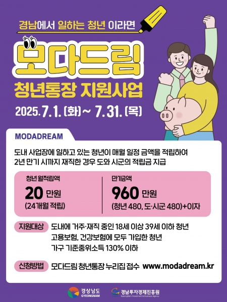 [아시아월드뉴스] 밀양시는 청년들의 자산 형성과 지역 정착을 돕기 위한 ‘모다드림 청년통장’ 참여자를 이달 말까지 모집한다고 2일 밝혔다.