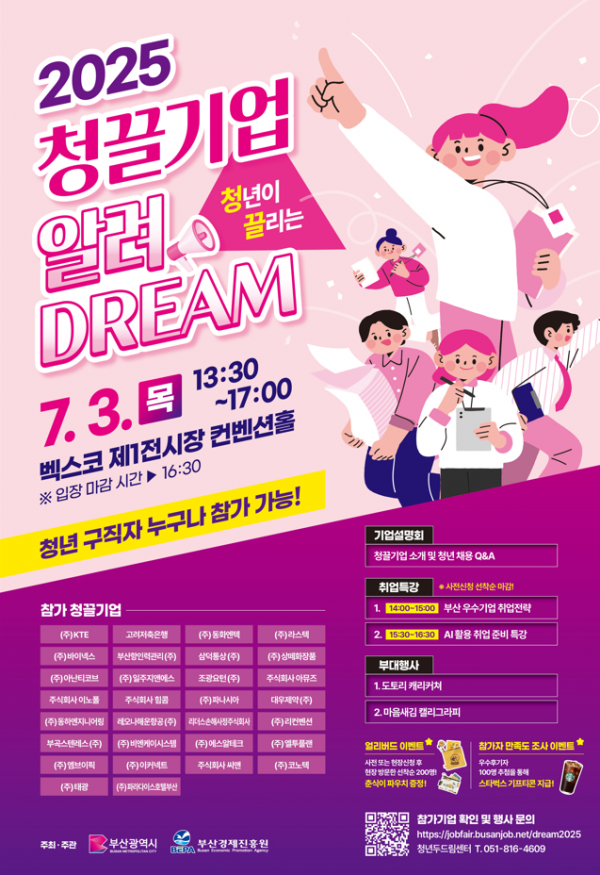 한편 오늘 오후 1시 30분 벡스코 컨벤션홀 2층에서는 부산의 우수기업 소개와 함께 맞춤형 채용정보 제공을 위한 '청끌기업 알려드림'이 함께 열린다.