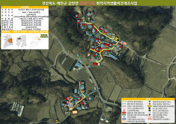이번에 선정된 용문면 하금곡2리와 감천면 장산2리 마을에는 2026년부터 4년간 국비 30억원을 포함한 총사업비 40억원을 투입해 위험지구 마을안길 및 축대 정비, 마을회관 리모델링, 빈집 철거, 슬레이트 지붕 철거 및 개량, 노후 집수리, 재래식 화장실 철거 및 개량, 담장 정비 등 생활 인프라를 확충하고 주거환경을 개선할 계획이다.