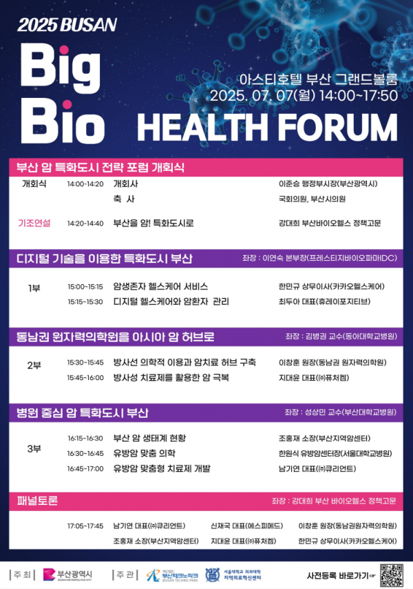△부산지역암센터 조홍재 소장 △큐리언트 남기연 대표 △동남권원자력의학원 이창훈 원장 △퓨쳐켐 지대윤 대표 △신재국 ㈜에스피메드 대표 △카카오헬스케어 한민규 상무이사가 토론자로 참여해 다양한 의견을 나눌 예정이다.