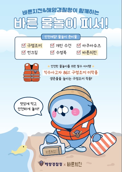 [아시아월드뉴스] 해양경찰청은 바른치킨과 함께 여름철을 맞아 구명조끼 착용 생활화를 통한 안전한 물놀이를 위한 협업해 홍보한다고 10일 밝혔다.