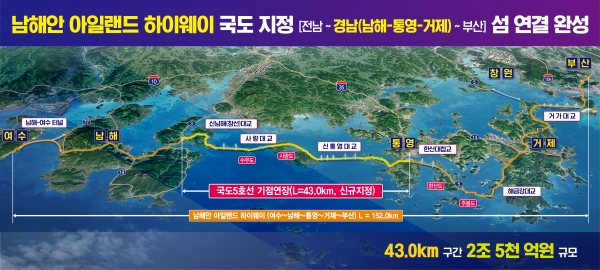 경상남도는 10일 “국토교통부가 국도 5호선 기점을 기존 통영시 도남동에서 남해군 창선면까지 43km 연장하는 계획을 확정·발표했다”고 밝혔다.