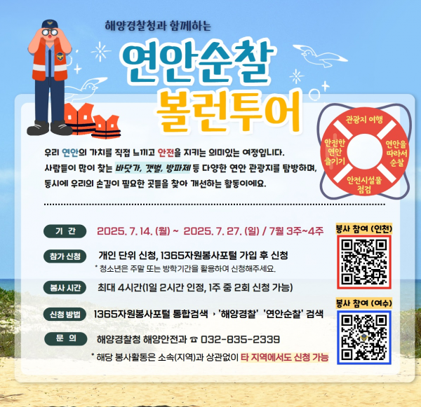 올해에는 △ 연안순찰 자원봉사 △ ‘물놀이 할때는 구세주’ 챌린지 △ 연안안전 초성퀴즈 참여 행사 △ 전국 주요 해수욕장 등에서 생존수영·심폐소생술 교육, 구명조끼 착용 체험 활동을 운영한다고 밝혔다.