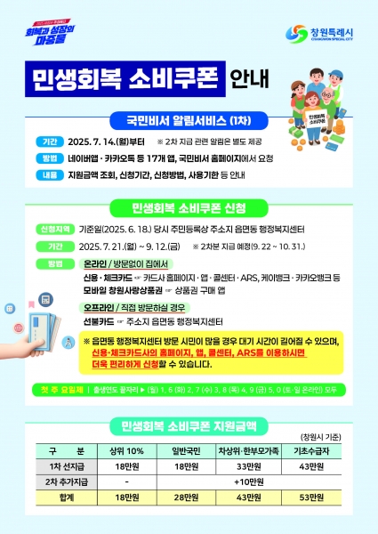 [아시아월드뉴스] 창원특례시는 오는 21일부터 ‘민생회복 소비쿠폰’ 1차 지급을 시작한다고 밝혔다.