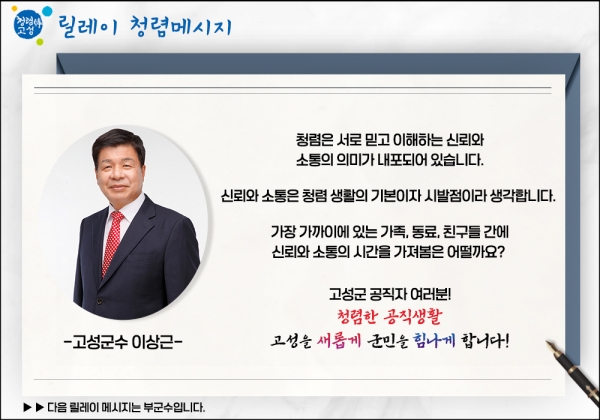 첫 번째 청렴메시지는 이상근 군수가 했으며 주요 내용은 ‘신뢰와 소통을 바탕으로 청렴한 공직생활이 고성을 새롭게 군민을 힘나게 한다’라는 메시지로 지역발전과 군민을 위해 청렴한 공직생활문화가 정착되어야 함을 밝혔다.
