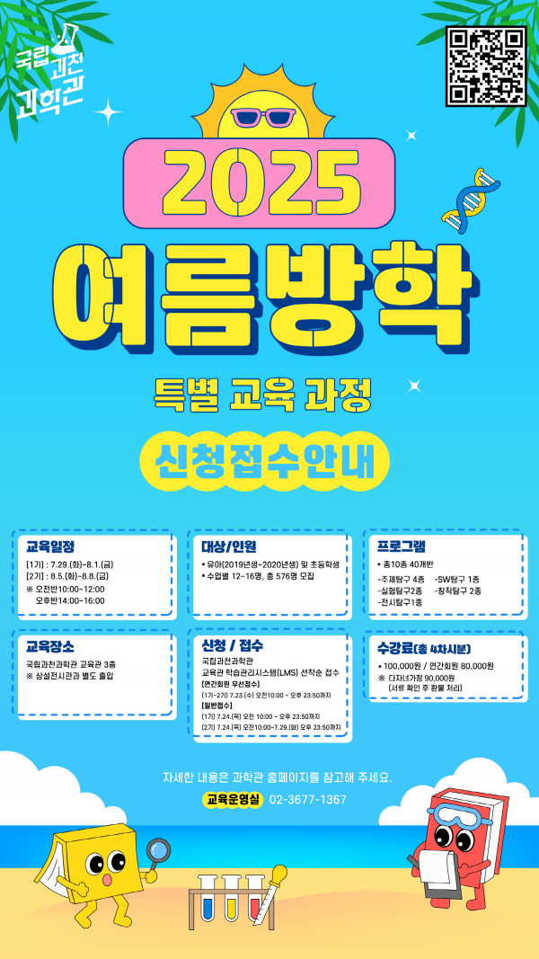 여름방학 개인 특별교육과정은 7월 24일부터 국립과천과학관 교육관 온라인 학습관리체계에서 신청할 수 있으며 국립과천과학관 누리집에서도 자세한 내용을 확인할 수 있다.