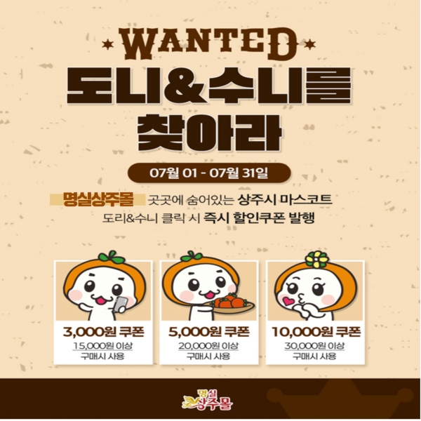 [아시아월드뉴스] 상주시를 대표하는 농특산물을 한자리에서 만나볼 수 있는 명실상주몰에서 쇼핑몰 곳곳에 숨어있는 상주시 마스코트인 도리와 수니 캐릭터를 찾아보는 게임을 통해 회원들에게는 3,000원, 5,000원, 1만원 할인쿠폰을 발급하는 7월 특별한 이벤트가 진행 중 이다.