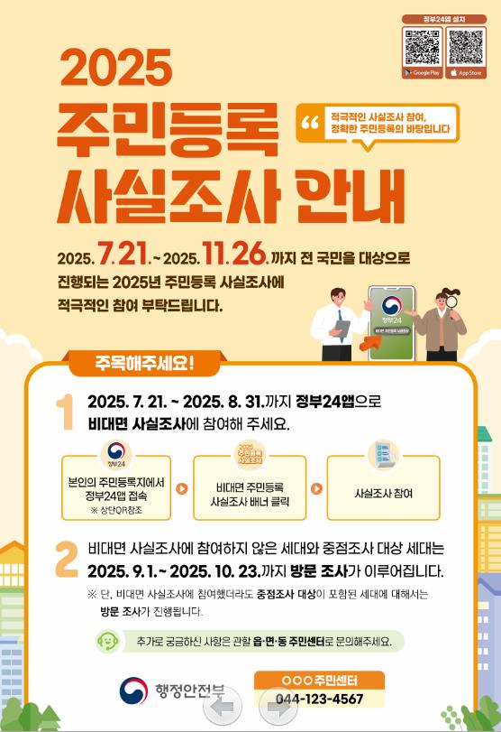 군 관계자는 “주민등록 사실조사를 통해 정책수립의 기초가 되는 주민등록자료를 현행화하고 잘못된 주민등록으로 인한 복지사각지대가 발생하지 않도록 노력하겠다”며 “정부24앱을 통한 비대면-디지털조사에 군민분들의 많은 관심과 적극적인 참여를 당부드린다”고 말했다.