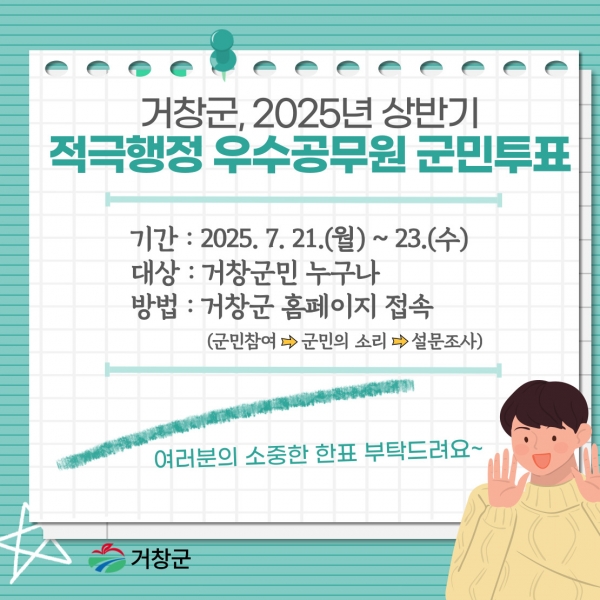 [아시아월드뉴스] 거창군은 7월 21일부터 23일까지 3일간 ‘2025년 상반기 적극행정 우수공무원 및 우수사례’ 선정을 위한 군민 온라인 투표를 진행한다.