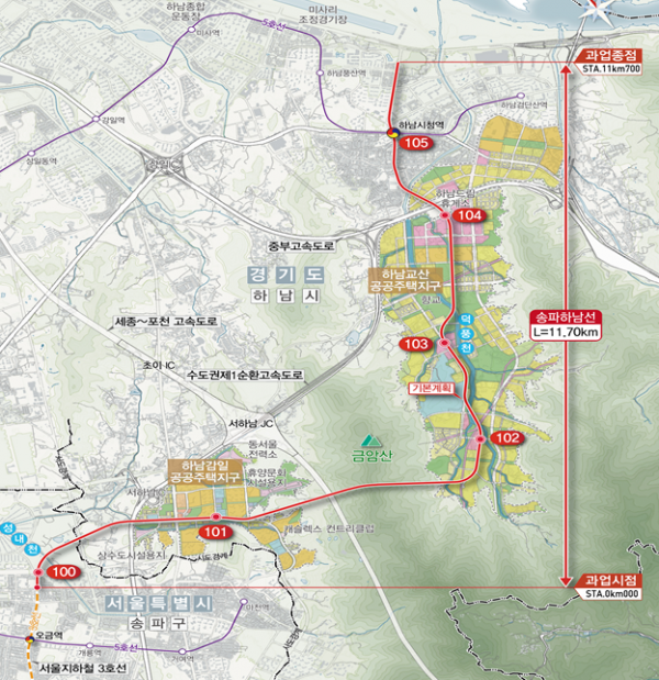 송파하남선은 현재 운행되고 있는 서울지하철 3호선 ‘대화~오금’ 구간을 하남시청역까지 연장하는 총 길이 11.7km의 광역철도 노선이며 기존 서울 도심과 하남 감일·교산 신도시를 경유한다.