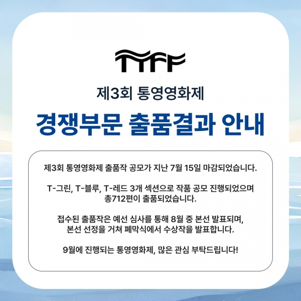 한편 올해 제3회 통영영화제는 한국영화인협회 통영지부 주최 주관, 통영시 후원으로 오는 9월 27일부터 29일까지 2박3일 동안 통영시 일원에서 개최된다.