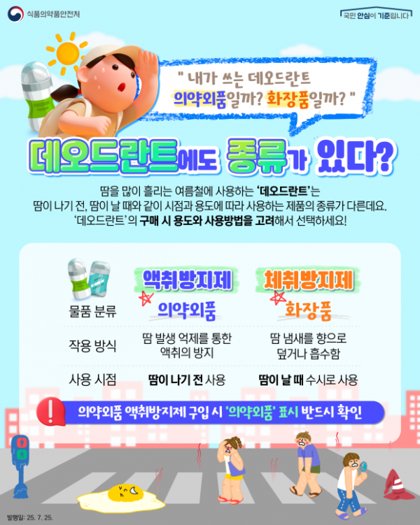 흔히 ‘데오드란트’로 불리는 제품은 의약외품으로 분류되는 ‘액취방지제’ 와 화장품으로 분류되는 ‘체취방지제’로 나뉘며 구매 시 제품의 용도와 올바른 사용 방법을 고려해 선택하는 것이 좋다.