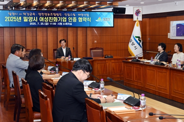 [아시아월드뉴스] 경남 밀양시는 25일 시청 소회의실에서 여성친화기업으로 선정된 △덕강금속 △영천영농조합법인 △진일스틸 △태영산업과 인증 협약을 체결했다.