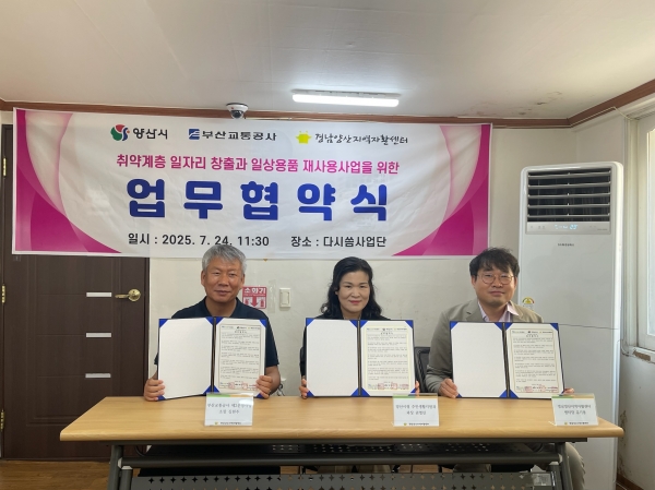 [아시아월드뉴스] 양산시는 취약계층 자립을 위한 자활사업 추진 및 자원재활용을 위해 양산시, 부산교통공사 제2운영사업소, 경남양산지역자활센터가 7월 24일 3자 업무협약을 체결했다고 밝혔다.