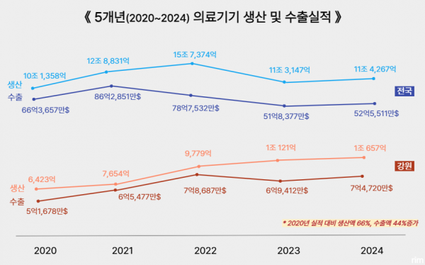 수출액뿐만 아니라 강원 의료기기 생산액은 같은 기간 6,423억원에서 1조 657억원으로 증가하며 연평균 13.5%의 높은 성장률을 기록했고 전국 생산 비중도 9.3%로 확대됐다.