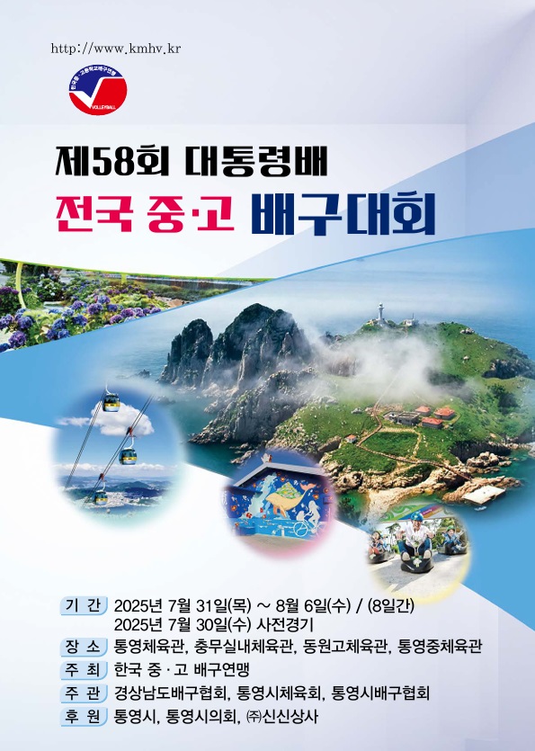 [아시아월드뉴스] 통영시에서는 대한민국 배구의 미래를 이끌어갈 중·고 배구 유망주들이 한자리에 모이는 ‘제58회 대통령배 전국 중·고배구대회’ 가 오는 30일부터 8월 6일까지 통영시 일원에서 개최된다고 밝혔다.