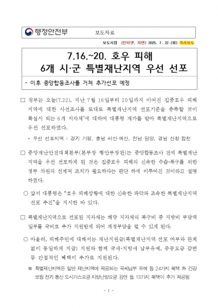 김윤철 군수는 “국가 간접지원 범위가 37개 항목으로 확대돼 군민들이 한층 두터운 해택을 받게 됐다”며 “합천군은 신속한 복구와 행정 지원으로 피해 주민들의 일상을 하루빨리 회복시키겠다”고 밝혔다.