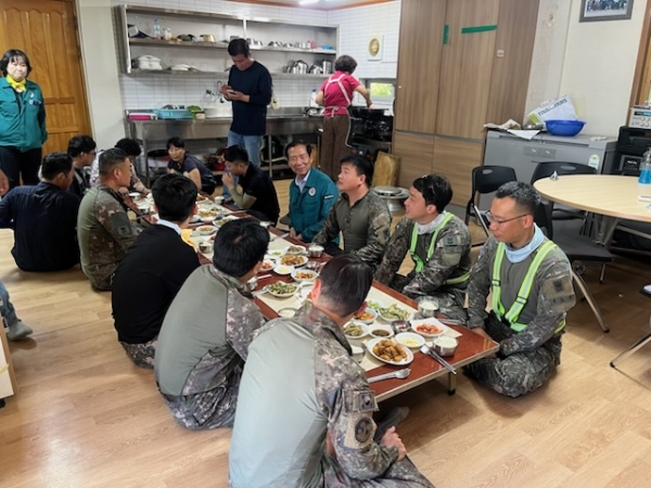 [아시아월드뉴스] 구인모 거창군수는 29일에 집중호우로 피해가 있는 신원면에서 대민 지원을 하는 제39보병사단 용호여단 함양산청거창대대 장병 16명을 찾아 격려했다.