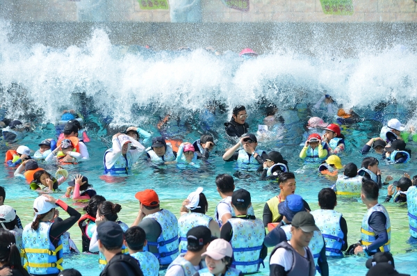 강동 워터파크는 인공 파도풀과 대형 슬라이드를 갖춘 종합 워터 테마시설이다.