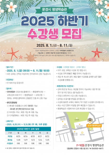 [아시아월드뉴스] 문경시 평생학습관은 2025년 하반기 수강생 총 760명을 8. 1. ~ 8. 11.까지 선착순으로 모집한다.