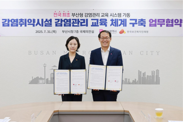 [아시아월드뉴스] 부산시는 어제 한국보건복지인재원과 '감염취약시설 감염관리 교육체계 구축'을 위한 업무협약을 체결하고 전국 최초로 지역맞춤형 '부산형 감염관리 교육 시스템'을 본격 개발·추진한다고 밝혔다.