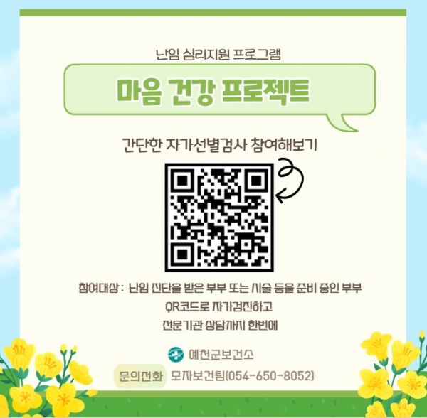 참여 희망자는 예천군보건소 모자보건팀을 방문하거나 전화 또는 홍보포스터의 QR코드를 통해 익명으로 쉽게 참여할 수 있고 연중 내내 신청 가능하다.