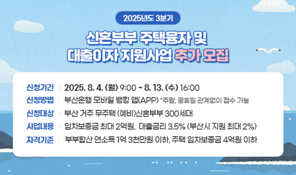 [아시아월드뉴스] 부산시는 올해 3분기 ‘신혼부부 주택융자 및 대출이자 지원사업’의 지원 대상자를 오늘부터 8월 13일까지 추가로 모집한다고 밝혔다.