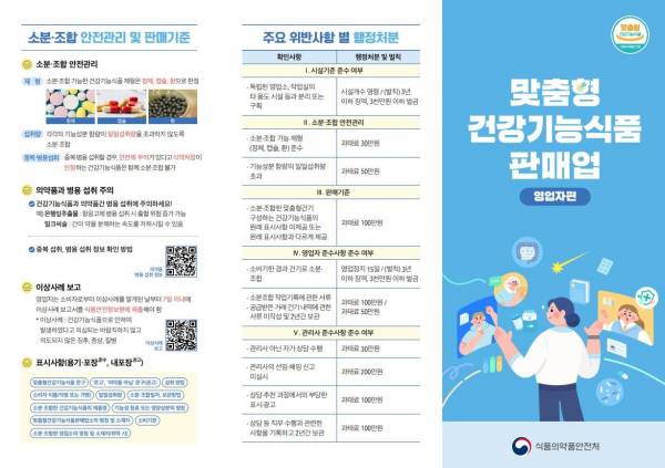 참고로 식약처는 맞춤형 건강기능식품에 대한 이해도를 높이기 위해 맞춤형 건강기능식품 소분·조합 안전관리, 이상사례 보고 및 표시사항, 주요 위반사항 등을 안내하는 ‘맞춤형 건강기능식품 법령·제도 등에 관한 종합안내서’를 발간했으며 자세한 내용은 식약처 누리집이나 식약처 식품안전나라 누리집에서 확인할 수 있다.