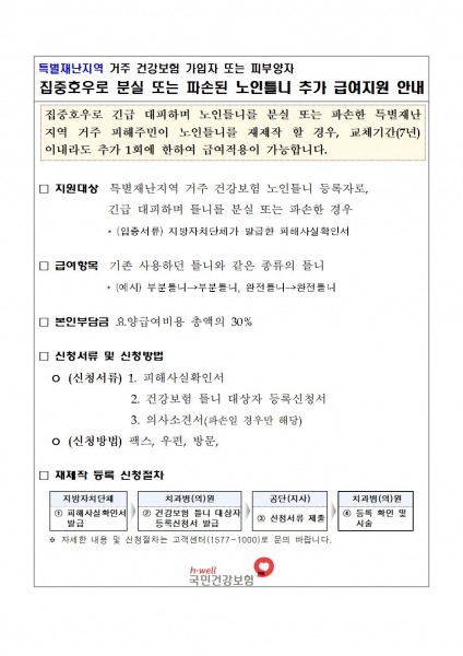 지원 대상은 특별재난지역에 거주하는 건강보험 가입자 또는 피부양자 중, 65세 이상 노인틀니 등록자로서 집중호우로 인해 긴급 대피하는 과정에서 틀니를 분실하거나 파손한 경우이다.