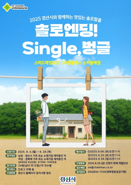 [아시아월드뉴스] 경산시는 8월 4일부터 8월 28일까지 약 4주간 미혼남녀를 위한 만남 행사 ‘2025 솔로탈출 single, 벙글’ 참가자 72명을 모집한다.
