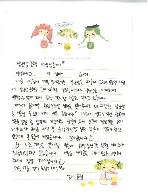 손편지에는 “희망장난감 신청 덕분에 다양한 장난감을 이용할 수 있게 되어 너무 좋았다”며 “거창군 아이들을 위해 많은 고민을 해주셔서 정말 감사드린다”는 진심 어린 감사의 마음이 담겨 있었다.