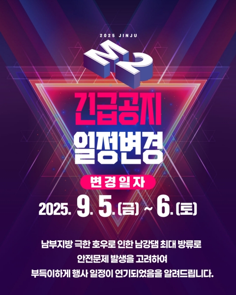 [아시아월드뉴스] 진주시와 진주문화관광재단은 8월 8일부터 9일까지 2일간 개최 예정이던 ‘진주 M2페스티벌’을 다음달 9월 5일부터 6일로 일정을 변경해 개최한다고 밝혔다.