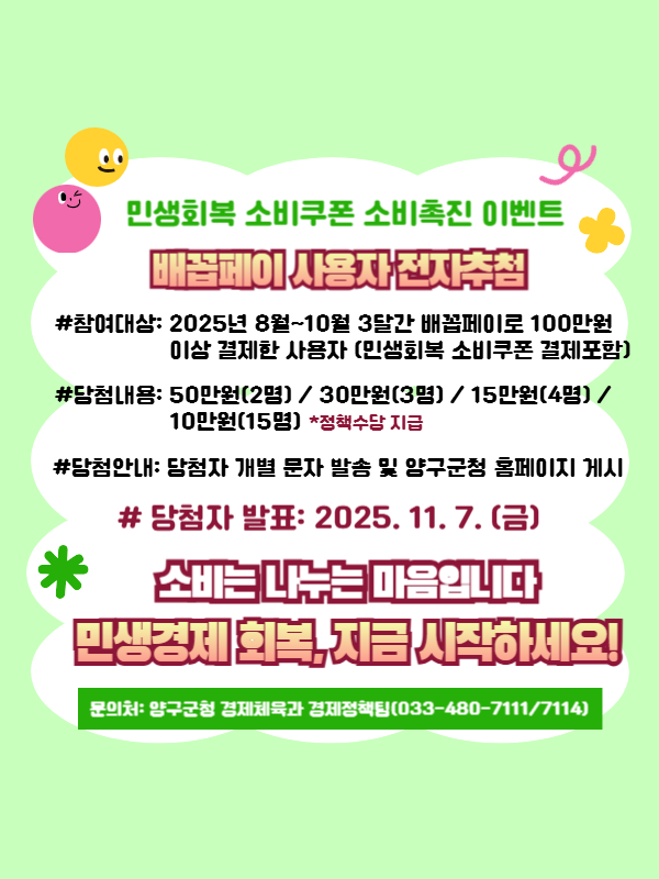 추첨 경품은 △50만원 2명 △30만원 3명 △15만원 4명 △10만원 15명이며 당첨자는 2025년 11월 7일 발표 후 개별 문자와 양구군청 홈페이지를 통해 공지된다.