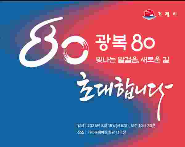 [아시아월드뉴스] 거제시는 오는 15일 오전 10시 30분, 거제문화예술회관 대극장에서 ‘빛나는 발걸음, 새로운 길’ 이라는 주제로 제80주년 광복절 경축식을 개최한다.
