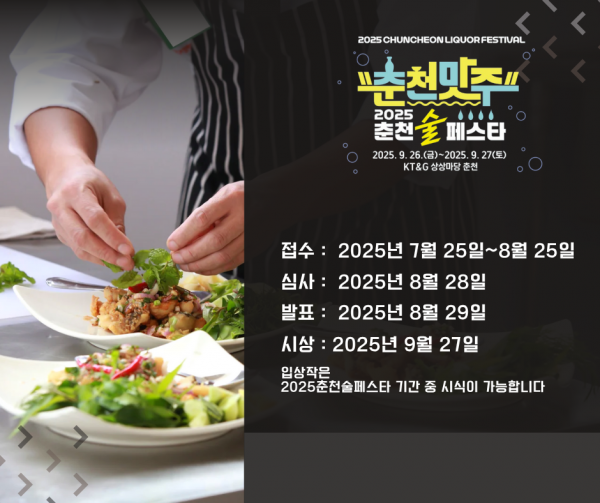 [아시아월드뉴스] 춘천시가 ‘2025 춘천 술 페스타’ 사전행사로 안주 레시피 경연대회 참가자를 오는 25일까지 공개 모집한다.